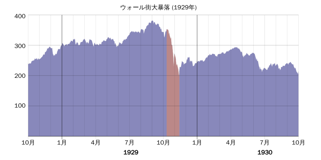 株価は1929年の9月に最高値を記録しますが、一部の投資家はアメリカ経済の実態と株価の間に乖離があることに気づき、先行きに不安を覚え始めます。株が値下がりする前に売却して資金を回収しようという心理が働き、株価はじわじわと下がり始めます。そして10月24日、「暗黒の木曜日」を迎えます。ウォール街のニューヨーク株式市場では株の売りが殺到し、株価が一斉に大暴落します。
